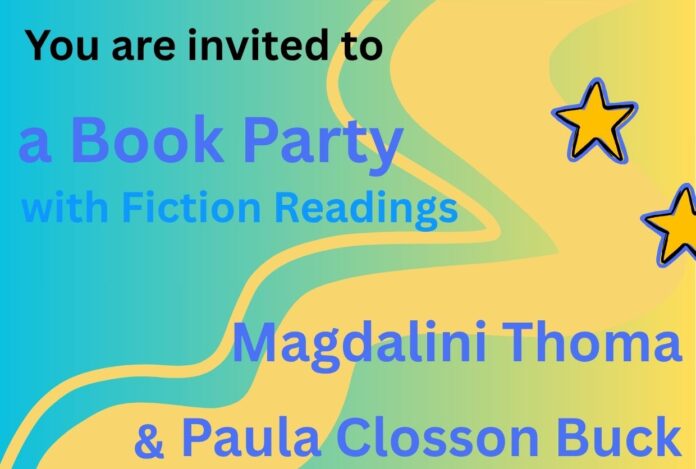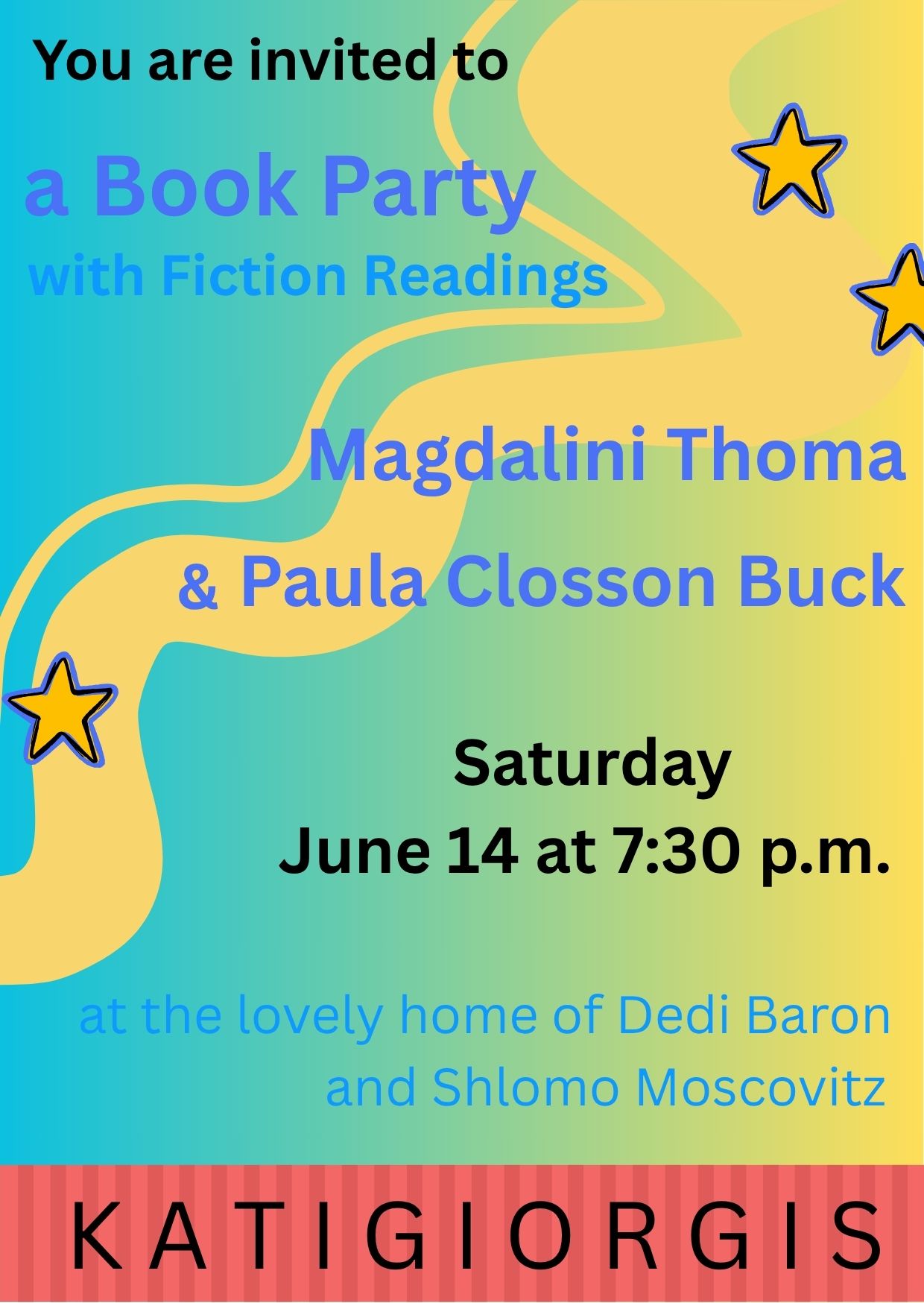 Μια λογοτεχνική βραδιά με αναγνώσεις κειμένων από τα πρόσφατα βιβλία της Paula Closson Buck, και της Μαγδαληνής Θωμά, προβλέπεται να γίνει στην εξοχική κατοικία ανοιχτού ορίζοντα, των Shlomo Moscovitz και Dedi Baron, στον Κατηγιώργη του νοτίου Πηλίου, στις 14 Ιουνίου και ώρα 19:30.