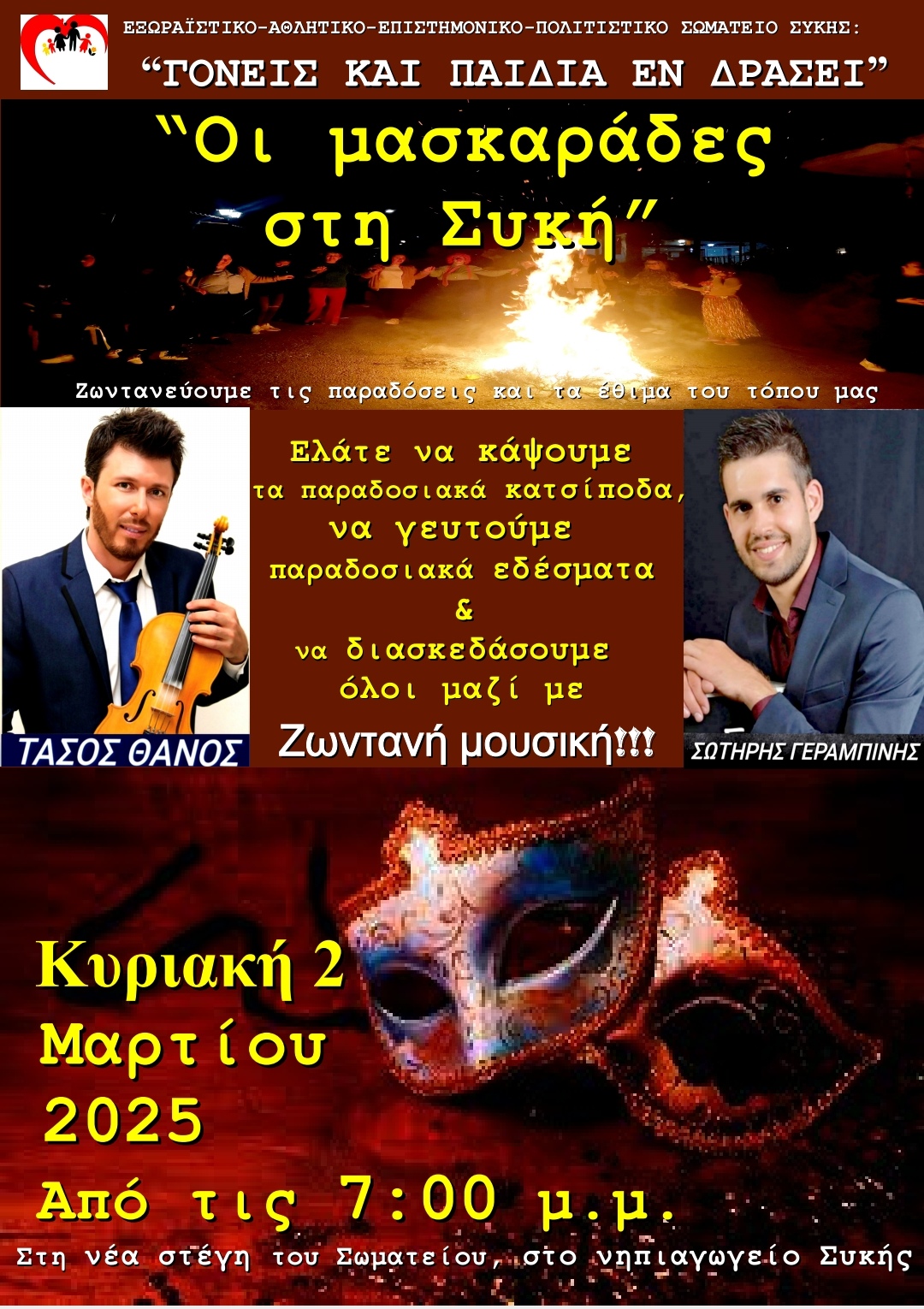 Μια ξεχωριστή αποκριάτικη εκδήλωση προγραμματίζεται για αύριο Κυριακή 2 Μαρτίου στη Συκή, με τον γενικότερο τίτλο “Μασκαράδες στη Συκή”
