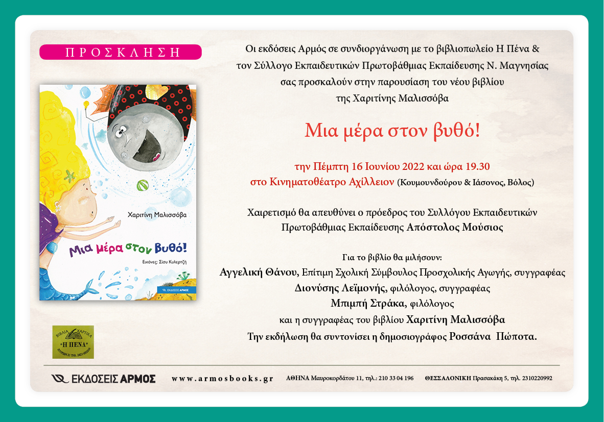 Οι εκδόσεις Αρμός σε συνδιοργάνωση με το βιβλιοπωλείο «Η Πένα» & τον Σύλλογο Εκπαιδευτικών Πρωτοβάθμιας Εκπαίδευσης Ν. Μαγνησίας πραγματοποιούν εκδήλωση παρουσίασης του νέου βιβλίου της Χαριτίνης Μαλισσόβα “Μια μέρα στον βυθό!” την Πέμπτη 16 Ιουνίου και ώρα 19.30 στο Κινηματοθέατρο Αχίλλειον (Κουμουνδούρου & Ιάσονος, Βόλος)