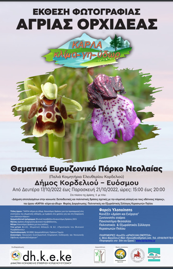 H συνεργασία με την Δημοτική Κοινωφελή Επιχείρηση Kορδελιού- Ευόσμου (Πρόεδρος κ. Πεσματζόγλου-Δεβετζή Φωτεινή) οδήγησε σε μια σπάνια και πρωτότυπη έκθεση φωτογραφίας, που θα φιλοξενηθεί στο Θεματικό Ευρυζωνικό Πάρκο Νεολαίας (Παλιά Κοιμητήρια Ελευθερίου Κορδελιού), στον Δήμο Κορδελιού – Ευόσμου, από Δευτέρα 17/10/2022 έως Παρασκευή 21/10/2022, ώρες: 15:00 έως 20:00. Όπως αναφέρεται σε σχετική ανακοίνωση, «η Έκθεση έχει ως θέμα ένα -μοναδικό σε ομορφιά και συμπεριφορά -φυτό, την Αυτοφυή Ορχιδέα, που ευδοκιμεί στην γύρω περιοχή της λίμνης Κάρλας Μαγνησίας και σήμερα κινδυνεύει από εξαφάνιση και θα είναι επισκέψιμη, δωρεάν, από κάθε πολίτη, από περιβαλλοντικές ομάδες και σχολεία της Α/βάθμιας και Β/Βάθμιας εκπαίδευσης μετά από συνεννόηση με τον υπεύθυνο της έκθεσης κ. Δημ. Οικονομίδη ( Τηλέφ. 6973-886471).