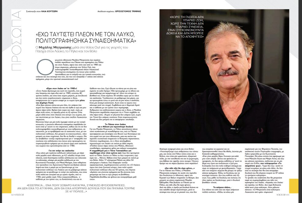 Ο αγαπημένος ηθοποιός Μιχάλης Μητρούσης είχε φιλοξενηθεί τον περασμένο Απρίλιο στις σελίδες τουπεριοδικού «VolosOut» του «Ομίλου Καρεκλίδη», μιλώντας για τον Λαύκο, την αγάπη του για το Πήλιο, στιγμές της καλλιτεχνικής του πορείας, το ατύχημα που του είχε συμβεί κ.α. Ορμώμενος απ΄την παρουσία του χθες στο ραδιόφωνο, εξέφρασε θερμά λόγια για το περιοδικό και την προσπάθεια που γίνεται από ένα περιφερειακό ΜΜΕ και τους ανθρώπους που εργάζονται σε αυτό, τονίζοντας παράλληλα, την εξαιρετική του αισθητική και θεματολογία: «Είναι έξοχο περιοδικό, με ωραίο φύλλο και ρεπορτάζ και πολύ καλή ταξινόμηση θεμάτων. Μπράβο!»