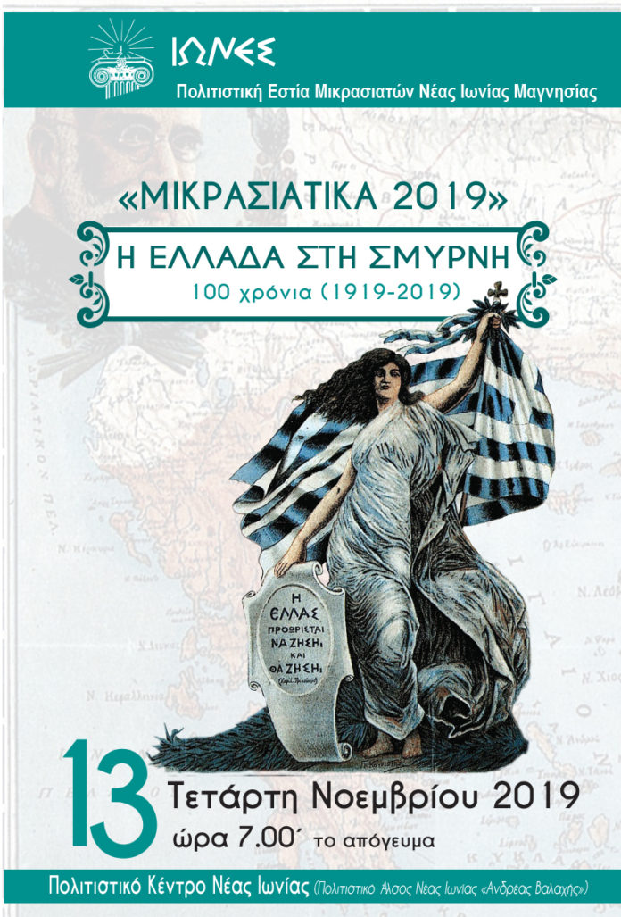Η Πολιτιστική Εστία Μικρασιατών Ν. Ιωνίας Μαγνησίας ΄΄Ιωνες΄΄ διοργανώνει εκδήλωση με θέμα: «Η ΕΛΛΑΔΑ ΣΤΗ ΣΜΥΡΝΗ-100 χρόνια (1919-2019)», η οποία θα πραγματοποιηθεί στο Θέατρο του Πολιτιστικού Κέντρου Νέας Ιωνίας, την Τετάρτη 13 Νοεμβρίου 2019 και ώρα 7.00 μ.μ. Η εκδήλωση εντάσσεται στο πλαίσιο του ετήσιου θεσμού ΄΄Μικρασιατικά 2019” , τον οποίο θέσπισε η Εστία ”Ίωνες” από τα πρώτα έτη δημιουργίας της , με σκοπό να αντλεί και να προβάλλει θέματα από την ιστορία και τον πολιτισμό του Μικρασιατικού Ελληνισμού.