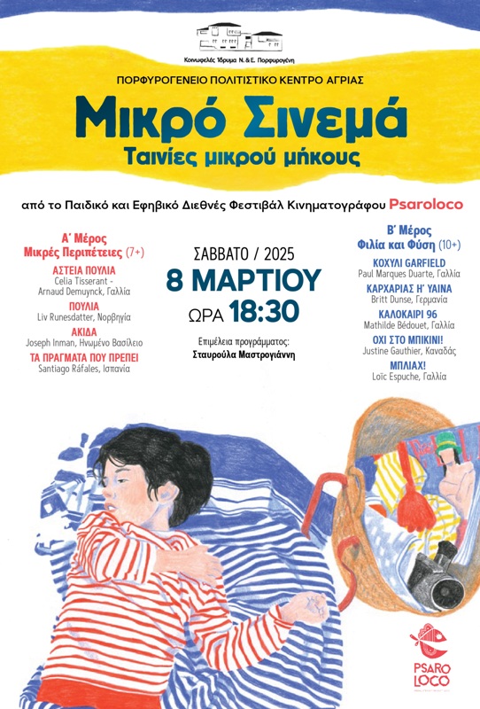 Το «Μικρό Σινεμά» του Μαρτίου συνεχίζει το αφιέρωμα σε επιλεγμένες ταινίες μικρού μήκους από το Παιδικό και Εφηβικό Διεθνές Φεστιβάλ Κινηματογράφου Psaroloco. Το Σάββατο 8 Μαρτίου, στις 18:30, στο Πολιτιστικό Κέντρο του Πορφυρογένειου Ιδρύματος Αγριάς θα προβληθούν εννέα ταινίες κινουμένων σχεδίων και μυθοπλασίας για παιδιά δημοτικού.