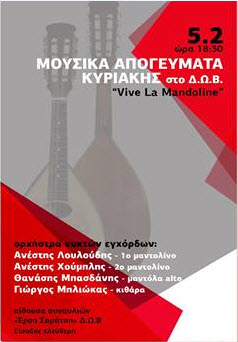 Μετά το «Πόντιουμ Νέων Καλλιτεχνών» ένας ακόμη κύκλος συναυλιών εγκαινιάζεται στον “Χειμωνανθό” ΙΙΙ. Ονομάζεται «Μουσικά απογεύματα Κυριακής στο Δ.Ω.Β.» και την Κυριακή 5 Φεβρουαρίου 2017, στις 18:30 στην αίθουσα συναυλιών ΕΡΣΗ ΣΑΡΑΤΣΗ του Δ.Ω.Β. θα έχουμε τη χαρά να απολαύσουμε την «Vive La Mandoline».