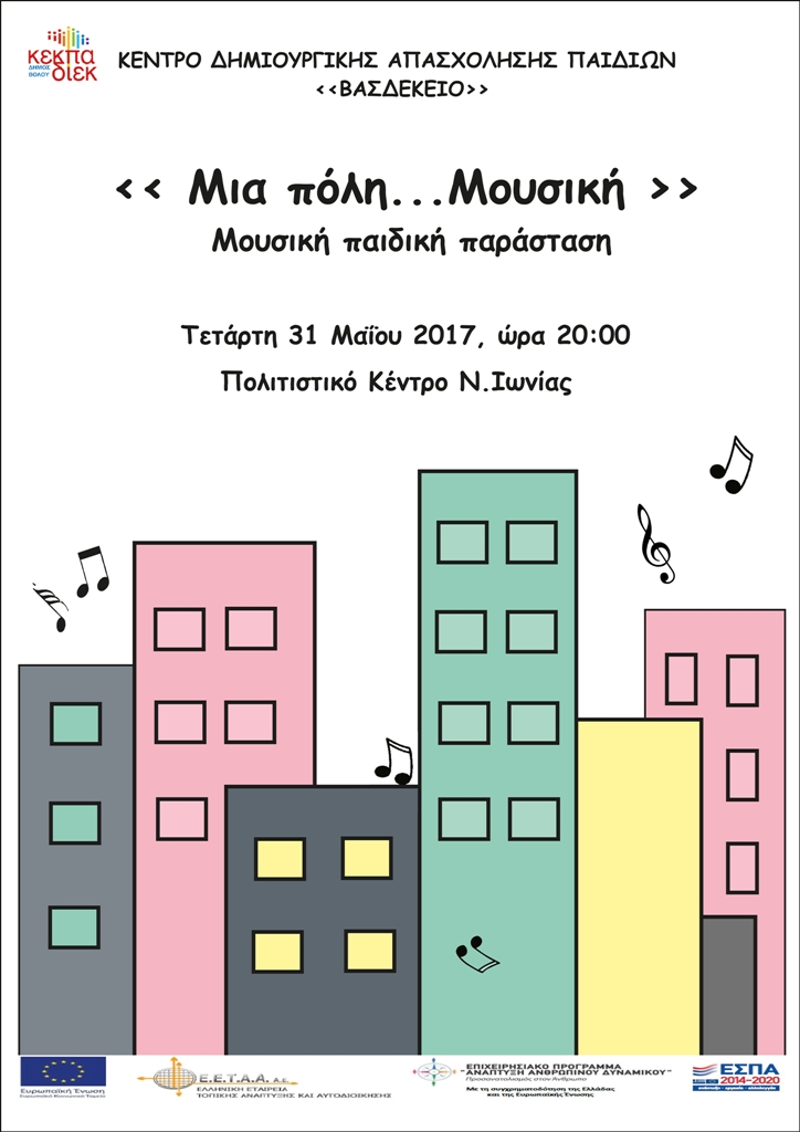 Την Τετάρτη 31 Μαΐου στις 8.00 το απόγευμα, θα πραγματοποιηθεί στο Θέατρο του Πολιτιστικού Κέντρου Ν. Ιωνίας, μουσική παράσταση από τα παιδιά του ΚΔΑΠ Βασδέκειο, δομή συγχρηματοδοτούμενη από την Ευρωπαϊκή Ένωση και την Ελλάδα στο πλαίσιο του ΕΣΠΑ 2014-2020.