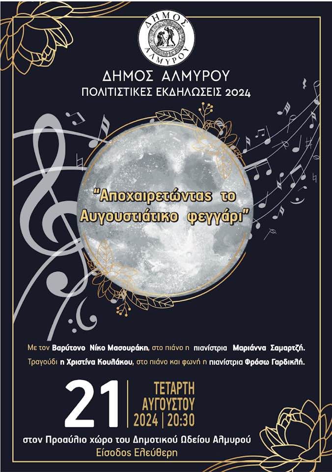 Ο βαρύτονος Νίκος Μασουράκης, η πιανίστρια Μαριάννα Σαμαρτζή, η τραγουδίστρια Χριστίνα Κουλάκου, μαζί με την πιανίστρια Φρόσω Γαρδικλή θα αποχαιρετήσουν το αυγουστιάτικο φεγγάρι σε μια εκδήλωση, με ελεύθερη είσοδο.