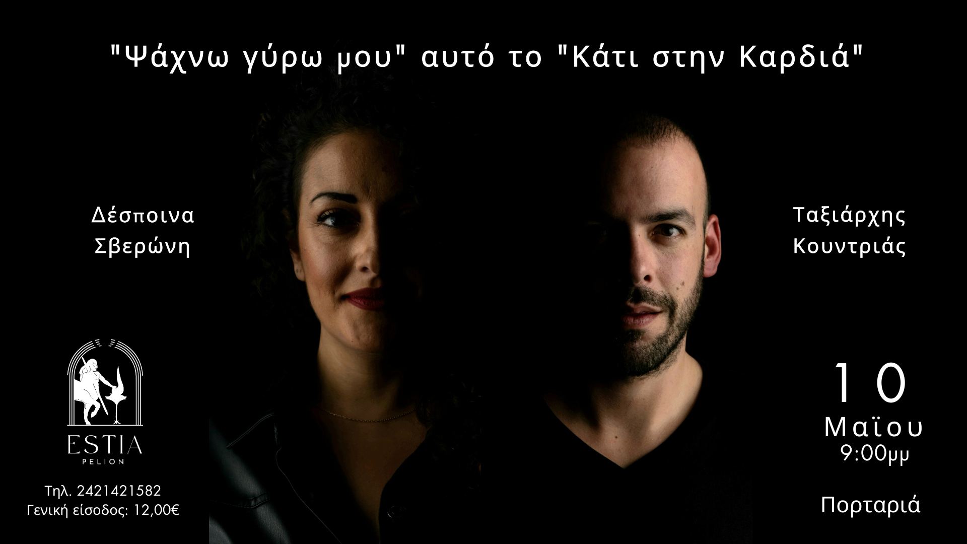 Η Δέσποινα Σβερώνη και ο Ταξιάρχης Κουντριάς, δύο καλλιτέχνες με χρόνια κοινής πορείας και βαθιά καλλιτεχνική σύνδεση, ενώνουν ξανά τις φωνές και τις ψυχές τους σε ένα μουσικό ταξίδι με συνοδοιπόρο μία κιθάρα, το Σάββατο 10 Μαΐου στην Πορταριά.