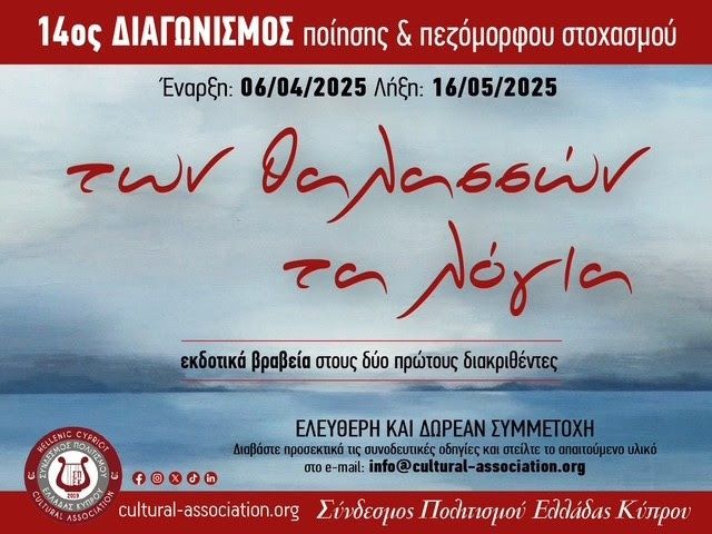 Ο Σύνδεσμος Πολιτισμού Ελλάδας Κύπρου προκηρύσσει τον 14ο Διαγωνισμό Ποίησης και Πεζόμορφου Στοχασμού με τίτλο «Των Θαλασσών τα Λόγια», τιμώντας τα 50 χρόνια από τον θάνατο του Νίκου Καββαδία (1910–1975), του ποιητή που κατέγραψε με τρόπο μοναδικό τη ναυτική ζωή, τη φυγή και το ταξίδι στο άγνωστο. Ο διαγωνισμός ξεκίνησε στις 6 Απριλίου 2025 και λήγει στις 16 Μαΐου 2025. Η συμμετοχή είναι ελεύθερη και δωρεάν.