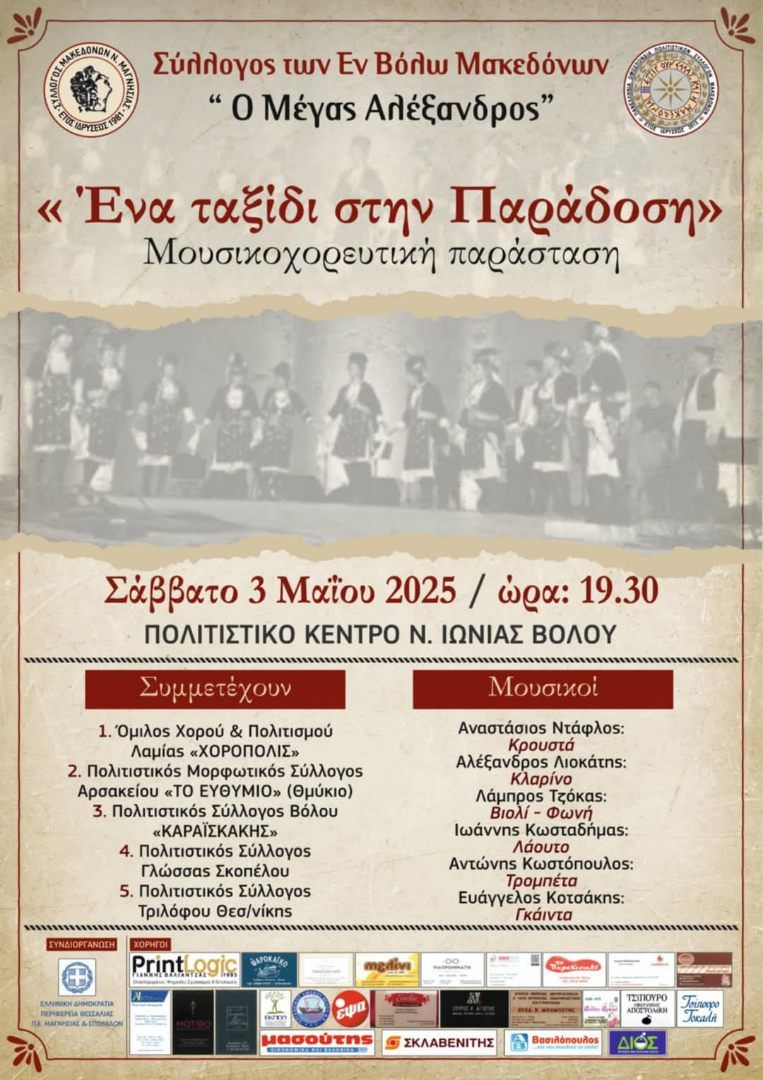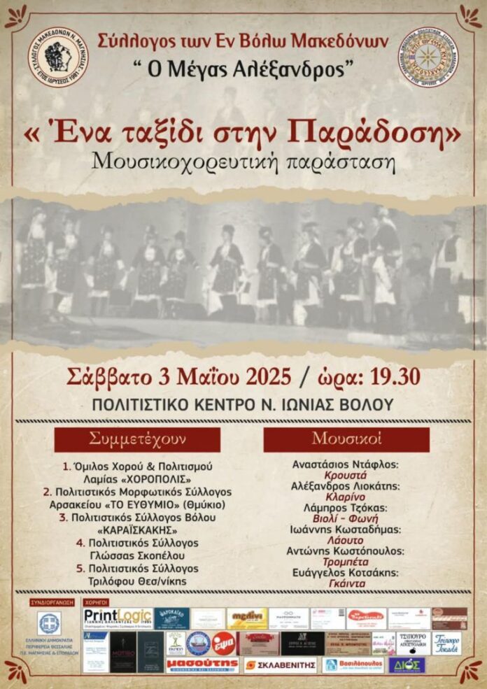 Μουσικοχορευτική παράσταση διοργανώνει το ερχόμενο Σάββατο 3 Μαΐου, στις 7.30 το απόγευμα στο Πολιτιστικό Κέντρο Νέας Ιωνίας ο Σύλλογος Μακεδόνων Βόλου «Μέγας Αλέξανδρος».