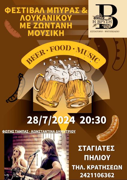 Φεστιβάλ μπίρας και λουκάνικου θα πραγματοποιηθεί την Κυριακή 28 Ιουλίου στην πλατεία των Σταγιατών στις 8.30 το βράδυ.