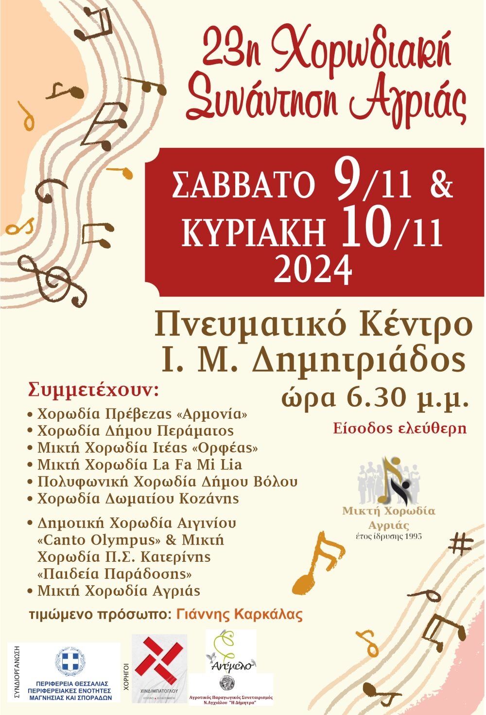 Η Μικτή Χορωδία Αγριάς, με τον μαέστρο της κ. Νίκο Αδρασκέλα διοργανώνει, με την αρωγή της Περιφέρειας Θεσσαλίας και του Σωματείου «Φίλοι της Μικτής Χορωδίας Αγριάς», αλλά και πολλών μικρών και μεγαλύτερων χορηγών, την 23η Χορωδιακή Συνάντηση, στο Πνευματικό Κέντρο της Ι. Μητροπόλεως Δημητριάδος, το Σαββατοκύριακο 9 και 10 Νοεμβρίου.