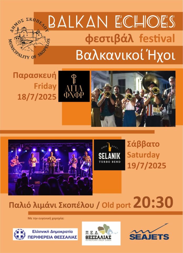 Ο Δήμος Σκοπέλου, με τη στήριξη της Περιφέρειας Θεσσαλίας, της ΠΕΔ Θεσσαλίας και την ευγενική χορηγία της ναυτιλιακής εταιρείας SEAJETS, παρουσιάζει ένα φεστιβάλ που υπόσχεται να καθηλώσει το κοινό με τον ήχο, την ενέργεια και τον αυθεντικό παλμό της Βαλκανικής μουσικής.
