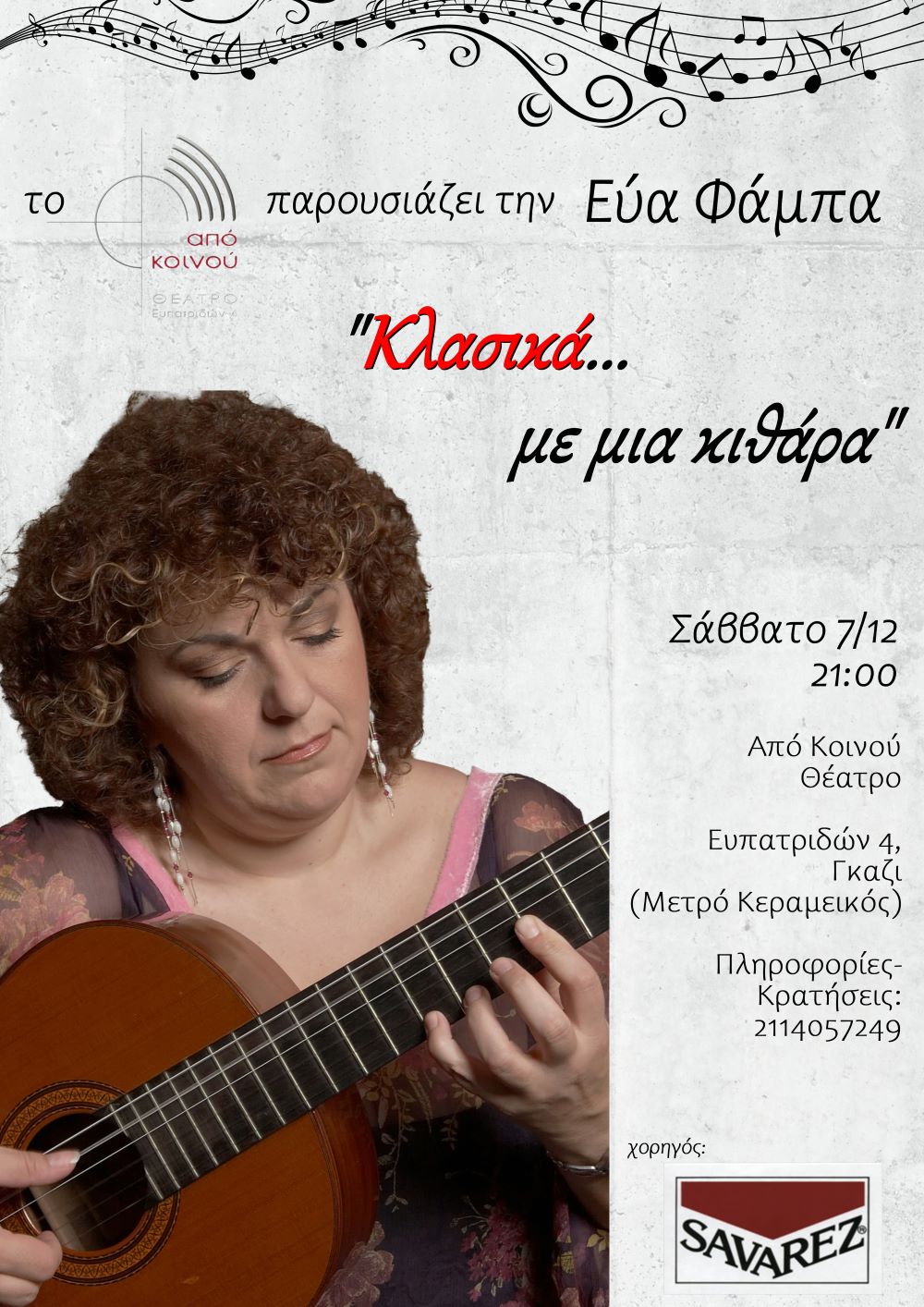 Το Σάββατο 7 Δεκεμβρίου στις 21:00 το Από Κοινού Θέατρο έχει τη χαρά να φιλοξενήσει τη σπουδαία καλλιτέχνιδα Εύα Φάμπα σ’ ένα μοναδικό ταξίδι-ρεσιτάλ κλασικής κιθάρας.