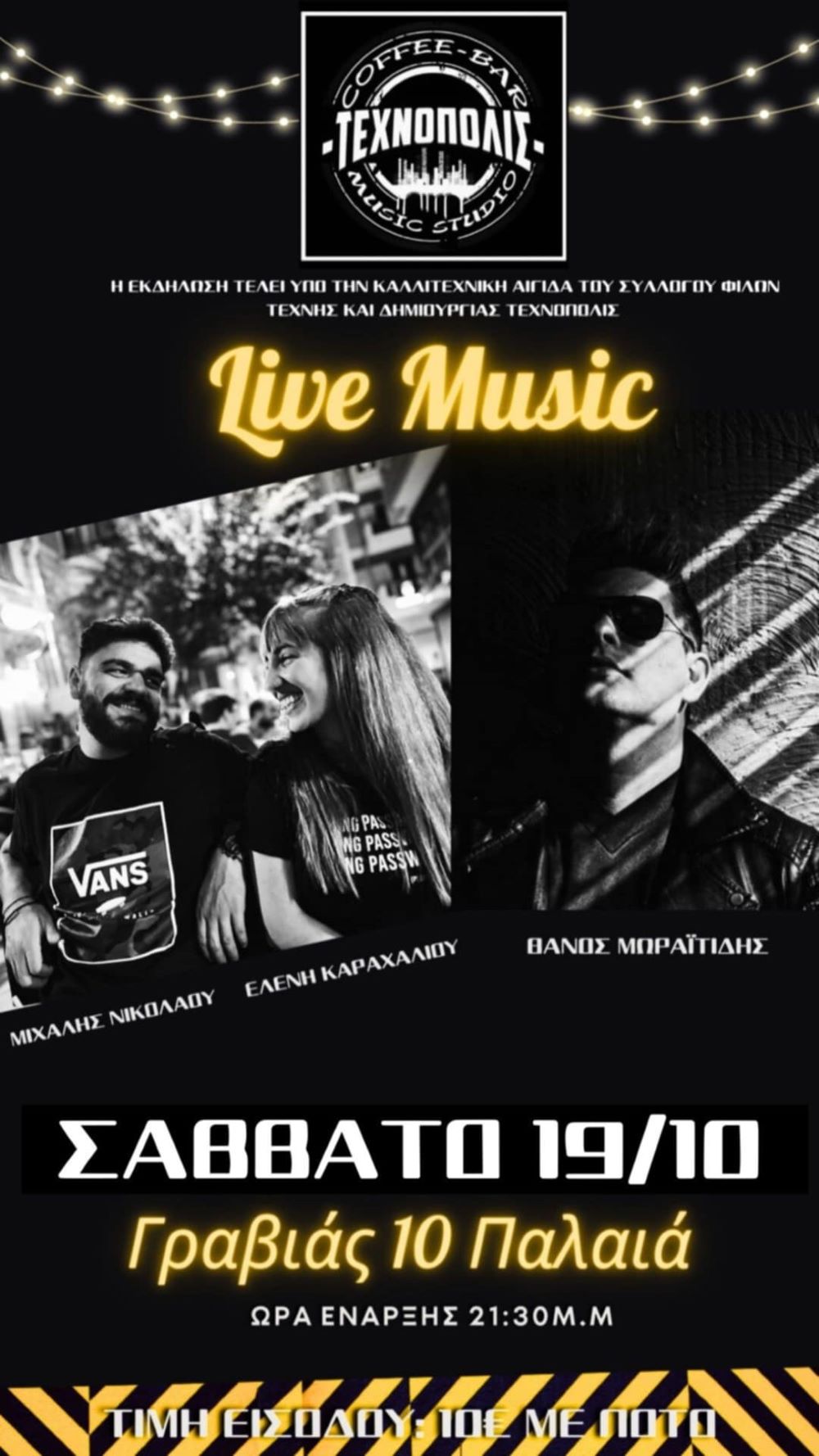 Τιμή εισόδου 10€ με ποτό. Γραβιάς 10 Παλαιά. Η εκδήλωση τελεί υπό την καλλιτεχνική αιγίδα του συλλόγου Φίλων τέχνης και δημιουργίας Τεχνόπολις.