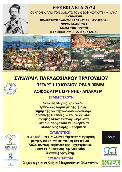 Αύριο Τετάρτη 10 Ιουλίου στις 9 το βράδυ στον λόφο της Αγίας Ειρήνης, θα γίνει μουσική εκδήλωση με παραδοσιακά τραγούδια της Μυτιλήνης και του Πηλίου από 6μελή ορχήστρα και χορωδία. Η εκδήλωση περιλαμβάνει τραγούδια από τις περιοχές που γεννήθηκε και έζησε ο Θεόφιλος δηλαδή: Τραγούδια της Λέσβου με το ιδιαίτερο μουσικό ιδίωμα, που δεν θυμίζει αιγαιοπελαγίτικο νησί και τραγούδια από το Πήλιο.