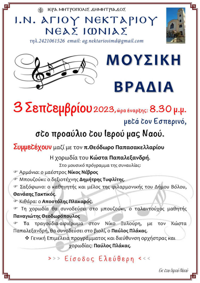 Μουσική εκδήλωση διοργανώνει ο Ιερός Ναός Αγίου Νεκταρίου Νέας Ιωνίας αύριο Τετάρτη 4/9, στις 8.30 μ.μ., στο προαύλιο χώρο του Ναού.