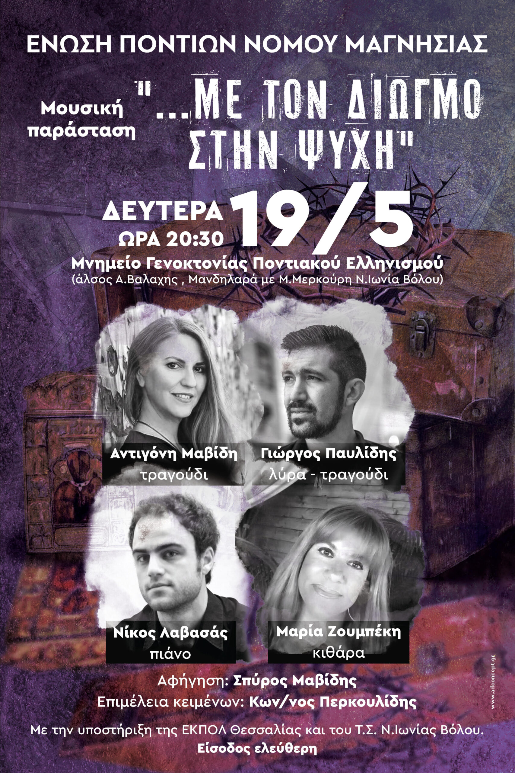 Μια μουσική παράσταση αφιερωμένη στη Μνήμη των θυμάτων της Γενοκτονίας των Ελλήνων του Πόντου θα πραγματοποιήσει η Ένωση Ποντίων Μαγνησίας, τη Δευτέρα 19 Μαΐου 2025 μπροστά στο Μνημείο Γενοκτονίας (Μανδηλαρά με Μ.Μερκούρη, Άλσος Α. Βαλαχή στη Ν. Ιωνία).