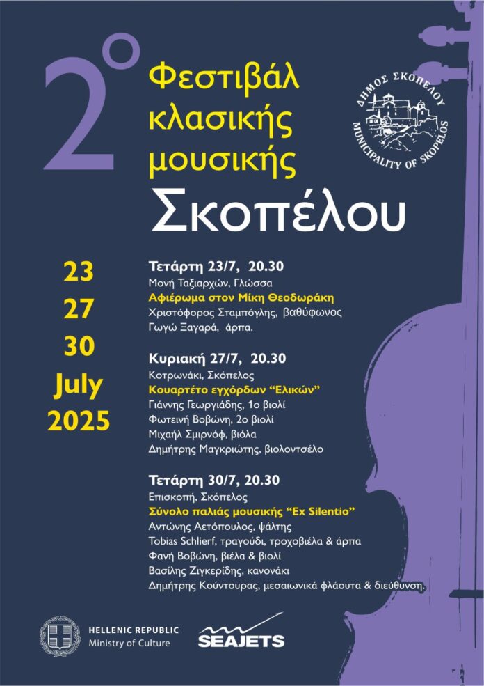 Μετά την επιτυχημένη διοργάνωση του πρώτου Φεστιβάλ Κλασικής Μουσικής το καλοκαίρι του 2024 και την ενθουσιώδη ανταπόκριση του κοινού, ο Δήμος Σκοπέλου με τη στήριξη του υπουργείου Πολιτισμού και την ευγενική χορηγία της ακτοπλοϊκής εταιρίας Seajets, επανέρχεται δυναμικά, παρουσιάζοντας το 2ο Φεστιβάλ Κλασικής Μουσικής, στις 23, 27 και 30 Ιουλίου 2025. Το φεστιβάλ επεκτείνεται φέτος και στη Γλώσσα, διατηρώντας την ιδιαίτερη φυσιογνωμία του. Τρεις συναυλίες, τρεις μαγευτικοί τόποι, τρεις στιγμές συνάντησης της μουσικής με την ιστορία, το τοπίο και τη μνήμη.