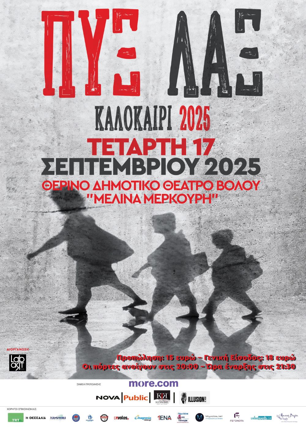 Την Τετάρτη 17 Σεπτεμβρίου στο ανοικτό θέατρο Μελίνα Μερκούρη στον Βόλο θα ανοίξει μια μεγάλη μουσική αγκαλιά, γεμάτη από τις μελωδίες και τους ρυθμούς των Πυξ Λαξ. Χωρίς απαγορευτικά, θα χρωματιστούμε όλοι από τις αξέχαστες μελωδίες τους. Επίκαιροι όσο ποτέ, οι Πυξ Λαξ συνεχίζουν να κάνουν αυτό που ξέρουν καλύτερα από κάθε άλλο ελληνικό συγκρότημα: να δίνουν αξέχαστες συναυλίες και να εκφράζουν όλα όσα θέλουμε να πούμε για παλιές και νέες αγάπες. Ετοιμαστείτε για μια συναυλία που θα μείνει ανεξίτηλη στη μνήμη, με τους Πυξ Λαξ να μας θυμίζουν γιατί παραμένουν αναντικατάστατοι στην κορυφή της ελληνικής σκηνής.