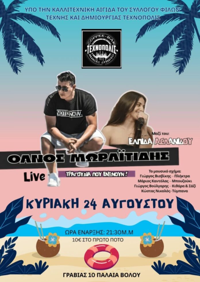 Το Ινστιτούτο Ανάπτυξης Πηλίου ενημερώνει το κοινό ότι η μουσική εκδήλωση με τον Θάνο Μωραΐτίδη, η οποία ήταν προγραμματισμένη να πραγματοποιηθεί τη Κυριακή 24 Αυγούστου στην παραλία Μελάνης, μεταφέρεται την ίδια ημερομηνία στον Βόλο, στις 9.30 το βράδυ στον χώρο του Τεχνόπολις, ώστε να μην ακυρωθεί.