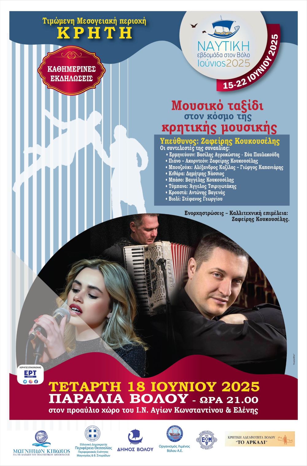 Όπως αναφέρει ο συνθέτης Ζαφείρης Κουκουσέλης «εμπνεόμενοι από την Κρητική παράδοση στο πλαίσιο των εκδηλώσεων της Ναυτικής Εβδομάδας 2025 παρουσιάζουμε μια ξεχωριστή μουσική συναυλία που θα μεταφέρει το κοινό σε έναν κόσμο γεμάτο ήχους και ιστορίες του νησιού. Μια βραδιά και ένα πρόγραμμα αφιερωμένο στους δημιουργούς και τους μουσικούς που έχουν ρίζες από την Κρήτη ή έχουν επηρεαστεί από την πολιτιστική κληρονομιά του νησιού.