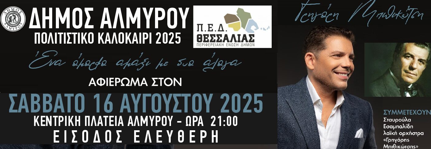 Το πολιτιστικό καλοκαίρι του Δήμου Αλμυρού συνεχίζεται, με συναυλία αφιέρωμα στον Γρηγόρη Μπιθικώτση, το Σάββατο 16 Αυγούστου στις 21:00 στην κεντρική πλατεία του Αλμυρού.