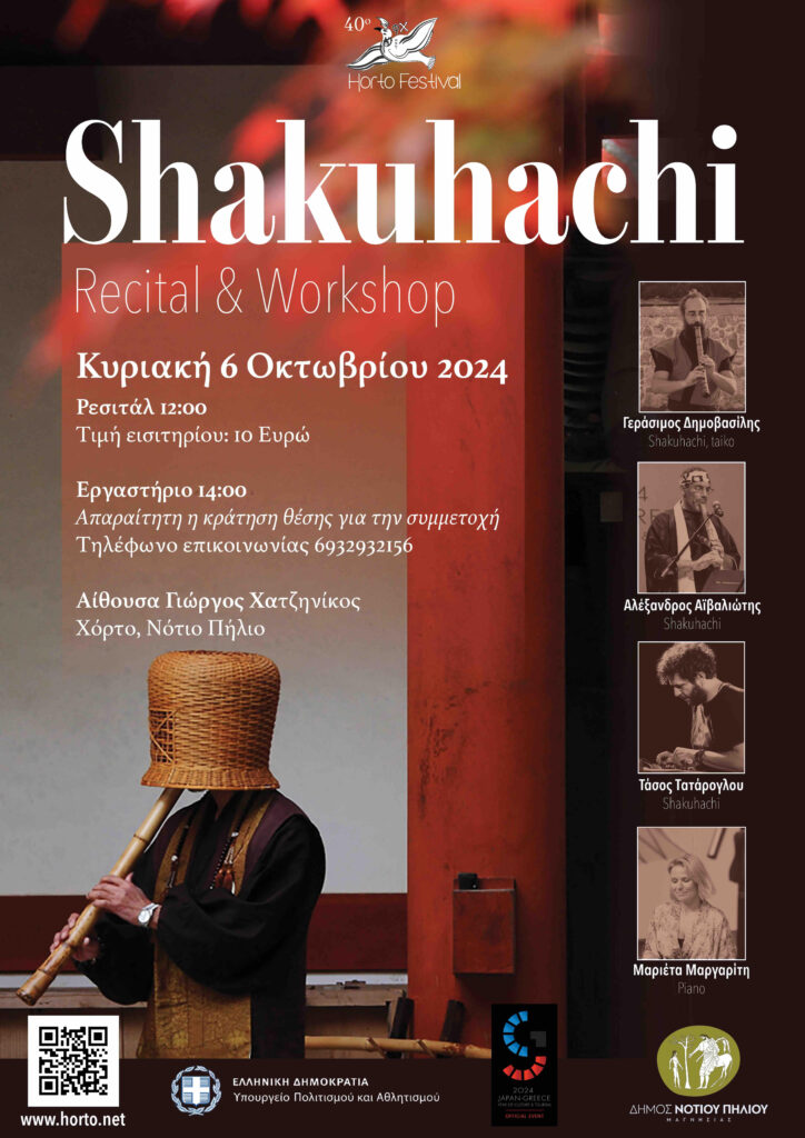 Την Κυριακή 6 Οκτωβρίου και ώρα 12:00 στην αίθουσα Γιώργος Χατζηνίκος, στο Χόρτο, θα διεξαχθεί ρεσιτάλ Ιαπωνικής παραδοσιακής και σύγχρονης μουσικής με βασικό όργανο το φλάουτο shakuhachi (尺八). Τα έργα θα ερμηνεύσουν οι μουσικοί Γεράσιμος Δημοβασίλης, Αλέξανδρος Αιβαλιώτης, Τάσος Τατάρογλου στο shakuhachi και η Μαριέτα Μαργαρίτη στο πιάνο.