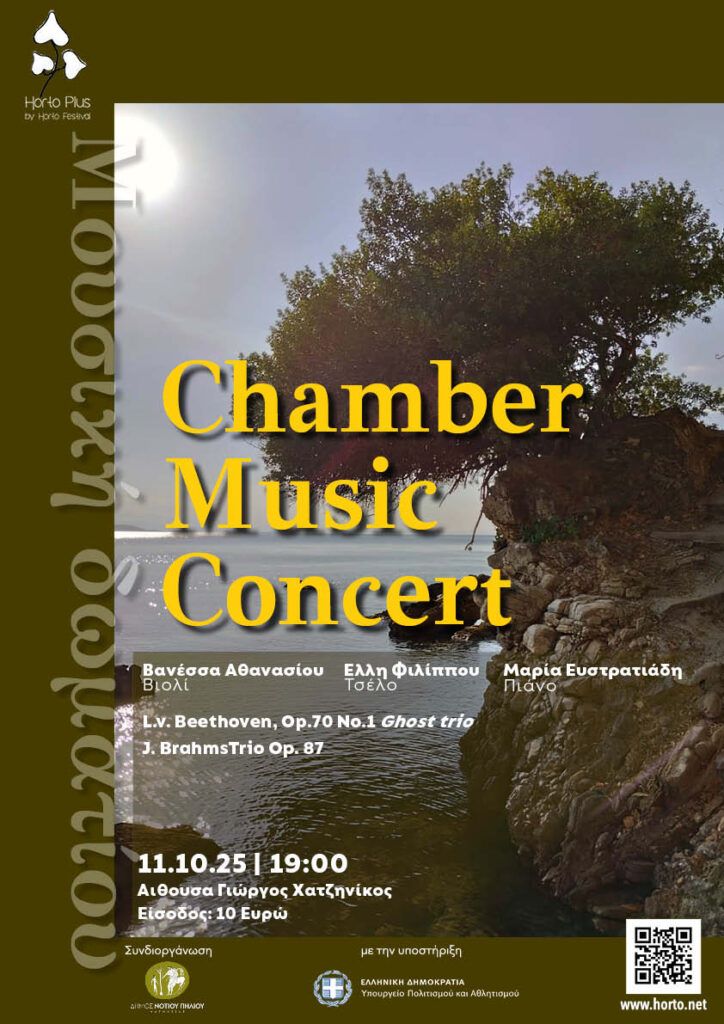 Συναυλία μουσικής δωματίου με έργα Μπετόβεν και Μπραμς θα πραγματοποιηθεί το Σάββατο 11 Οκτωβρίου στις 7 το απόγευμα στην αίθουσα Γιώργος Χατζηνίκος στο Χόρτο, με τη Βανέσσα Αθανασίου στο βιολί, την Έλλη Φιλίππου στο τσέλο και τη Μαρία Ευστρατιάδου στο πιάνο. Είσοδος 10 ευρώ.