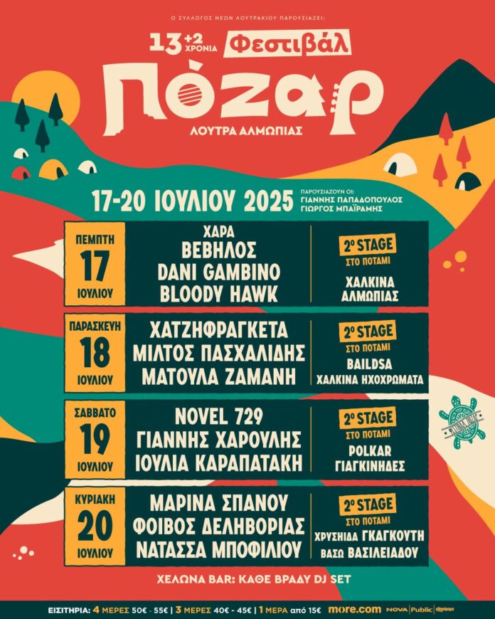 Οι καλοκαιρινές συναυλίες κάτω από τον έναστρο ουρανό επιστρέφουν! Το 13ο+2 Φεστιβάλ Πόζαρ 2025 έρχεται τον Ιούλιο στα Λουτρά Αλμωπίας, προσφέροντας μέρες και νύχτες γεμάτες μουσική, ενέργεια και φυσικά, κάμπινγκ στη φύση. Και το ακόμα καλύτερο;