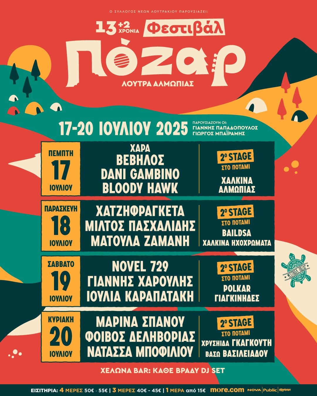 Το πάρτι δεν βρίσκεται μόνο στην κεντρική σκηνή – το 2o stage είναι θρυλικό για τα live του – και φέτος το κοινό θα μαγέψουν οι POLKAR, ΧΑΛΚΙΝΑ ΑΛΜΩΠΙΑΣ, BAILDSA, ΧΑΛΚΙΝΑ ΗΧΟΧΡΩΜΑΤΑ, ΓΙΑΓΚΙΝΗΔΕΣ, ΒΑΣΩ ΒΑΣΙΛΕΙΑΔΟΥ και η ΧΡΥΣΗΙΔΑ ΓΚΑΓΚΟΥΤΗ με την μπάντα της! Και όταν στις σκηνές τα φώτα σβήσουν, έρχονται οι βραδιές με dj set στο Χελώνα Μπαρ, μέσα στα δέντρα!