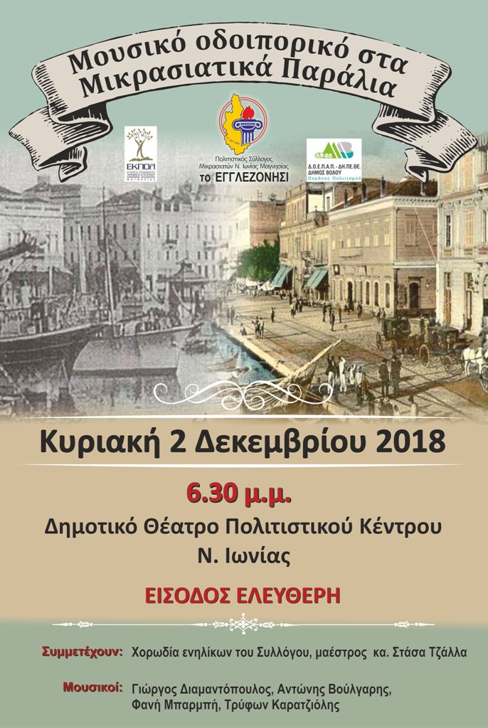 Ο Πολιτιστικός Σύλλογος Μικρασιατών Νέας Ιωνίας Μαγνησίας “ Το Εγγλεζονήσι” ολοκληρώνει τον ετήσιο κύκλο εκδηλώσεων του για τα “30 χρόνια Εγγλεζονήσι” με ένα “Μουσικό οδοιπορικό στα Μικρασιατικά παράλια”, που θα πραγματοποιηθεί με την συνεργασία της Εταιρείας Κοινωνικής Παρέμβασης & Πολιτισμού (ΕΚΠΟΛ) της Περιφέρειας Μαγνησίας και της Δ/νσης Πολιτισμού του ΔΕΟΠΑΠ – ΔΗΠΕΘΕ Δήμου Βόλου, την Κυριακή 2 Δεκεμβρίου 2018 στις 18:30, στο θέατρο του Πολιτιστικού Κέντρου Ν. Ιωνίας (Σταδίου – Μανδηλαρά).