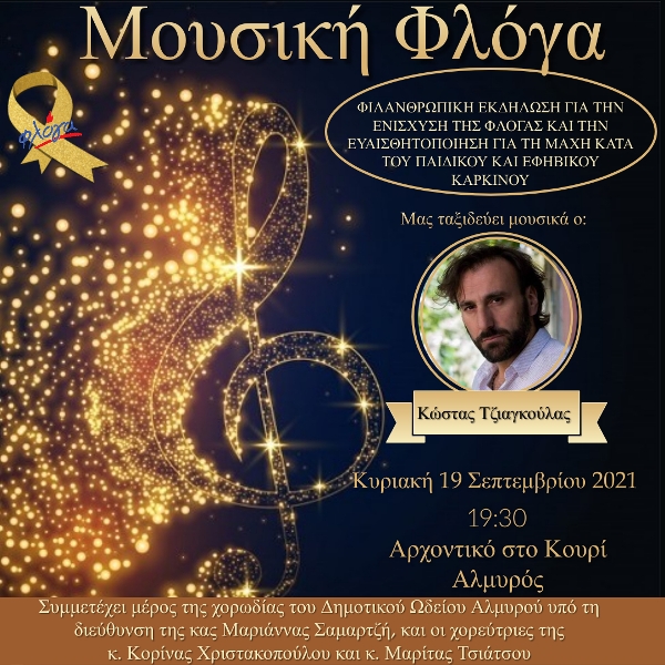 Το παράρτημα Μαγνησίας της «Φλόγας», που είναι ο Σύλλογος Γονιών Παιδιών με Νεοπλασματική Ασθένεια, και οι φίλοι της «Φλόγας» στην περιοχή του Αλμυρού διοργανώνει μουσική εκδήλωση την Κυριακή 19 Σεπτεμβρίου 2021 στις 19:30 στο Αρχοντικό στο Κουρί, στον Αλμυρό, «με σκοπό να ενισχύσουμε οικονομικά το θεάρεστο έργο του Συλλόγου και να τιμήσουμε τον Σεπτέμβριο ως μήνα ευαισθητοποίησης του κοινού για τη μάχη ενάντια στον παιδικό και εφηβικό καρκίνο» όπως αναφέρεται σε σχετική ανακοίνωση.
