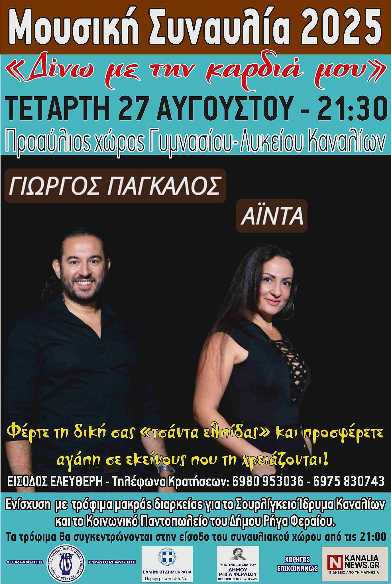 Στη σκηνή θα εμφανιστούν οι καταξιωμένοι καλλιτέχνες Γιώργος Πάγκαλος και Αΐντα, προσφέροντας στο κοινό μια μοναδική βραδιά γεμάτη μουσική, κέφι και συγκίνηση. Η συναυλία έχει έντονο φιλανθρωπικό χαρακτήρα, με στόχο την ενίσχυση του Σουρλίγκειου Ιδρύματος Καναλίων και του Κοινωνικού Παντοπωλείου του Δήμου Ρήγα Φεραίου. Οι παρευρισκόμενοι καλούνται να συνεισφέρουν φέρνοντας τρόφιμα μακράς διάρκειας, δημιουργώντας έτσι τη δική τους «τσάντα ελπίδας» για όσους έχουν ανάγκη.