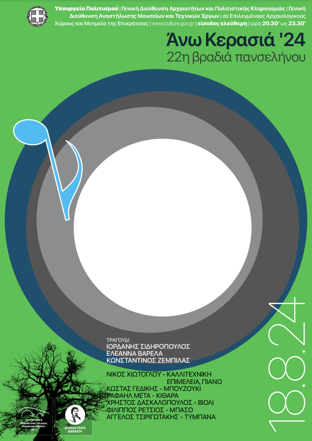 Η Υπηρεσία Νεωτέρων Μνημείων και Τεχνικών Έργων Θεσσαλίας και Κεντρικής Στερεάς Ελλάδας, στο πλαίσιο της ετήσιας διοργάνωσης εκδηλώσεων σε αρχαιολογικούς χώρους, μνημεία και μουσεία του Υπουργείου Πολιτισμού τη νύχτα της πανσελήνου του Αυγούστου, σε συνεργασία με τον Δήμο Ρήγα Φεραίου και τον Πολιτιστικό & Εξωραϊστικό Σύλλογο Κερασιωτών Πηλίου, διοργανώνουν μουσική βραδιά και καλούν όλους να απολαύσουν τραγούδια και μελωδίες των διαχρονικών συνθετών υπό το “φως” της πανσελήνου, στον ιστορικό τόπο της Άνω Κερασιάς Πηλίου, στο προαύλιο του παλιού Δημοτικού Σχολείου του χωριού (“Τσαΐρι”), την Κυριακή 18 Αυγούστου. Διάρκεια εκδήλωσης: 20:30 – 23:30. Η είσοδος στην εκδήλωση είναι ελεύθερη για το κοινό.