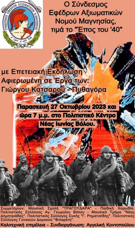 Ο Σύνδεσμος Έφεδρων Αξιωματικών Νομού Μαγνησίας, τιμά το «Έπος του ’40» διοργανώνοντας ένα μελωδικό ιστορικό Αφιέρωμα εμπνευσμένο από έργα των Γιώργου Κατσαρού και Πυθαγόρα την Παρασκευή 27 Οκτωβρίου στις 7 το απόγευμα στο Πολιτιστικό Κέντρο Νέας Ιωνίας.