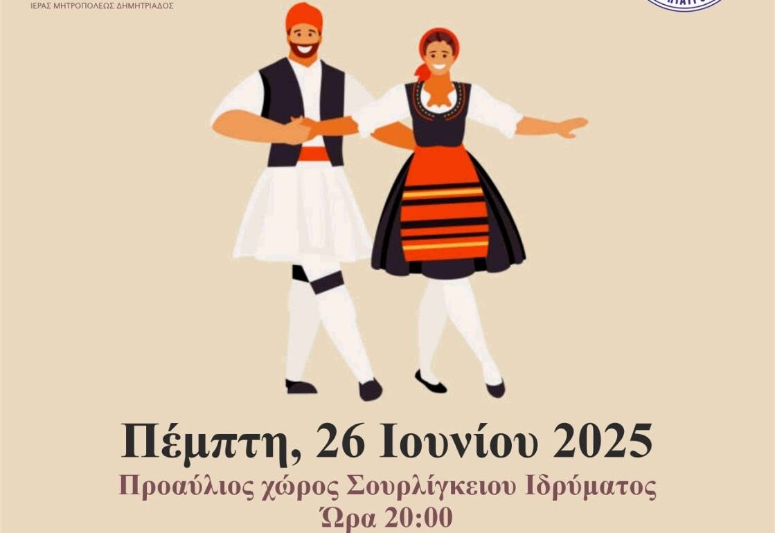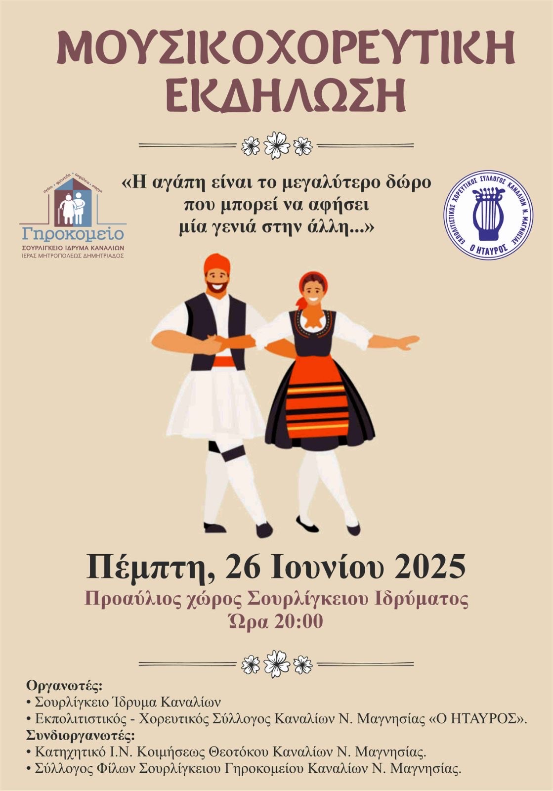 Μουσικοχορευτική εκδήλωση πραγματοποιείται την Πέμπτη 26 Ιουνίου στον προαύλιο χώρο του Σουρλίγκειου Ιδρύματος στις 20:00. Την εκδήλωση διοργανώνει το Σουρλίγκειο Ίδρυμα Καναλίων και το Εκπολιτιστικός- Χορευτικός Σύλλογος Καναλίων Μαγνησίας «ο ΗΤΑΥΡΟΣ». Συνδιοργανωτές το Κατηχητικό του Ι.Ν. Κοιμήσεως Θεοτόκου Καναλίων Μαγνησίας και ο Σύλλογος Φίλων Σουρλίγκειου Γηροκομείου Καναλίων Ν. Μαγνησίας.