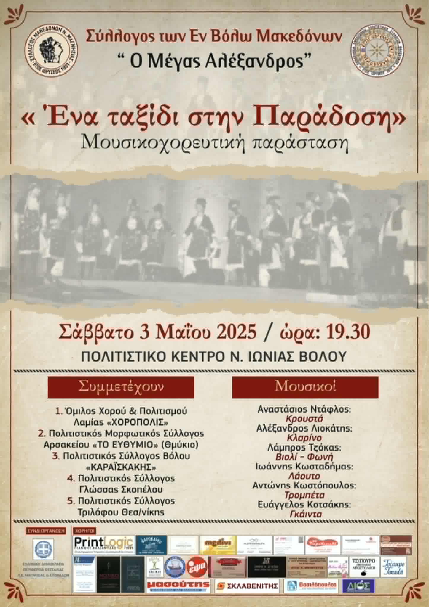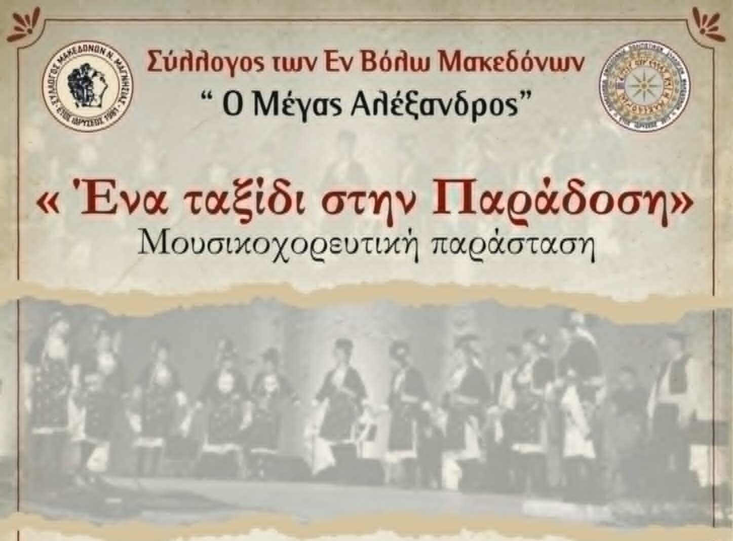 O Σύλλογος Μακεδόνων Βόλου «Ο Μέγας Αλέξανδρος» το Σάββατο 3 Mαΐου και ώρα 19:30 στο Πολιτιστικό Κέντρο Ν. Ιωνίας , διοργανώνει μουσικοχορευτική παράσταση με τίτλο «Ένα ταξίδι στην παράδοση» με τη συμμετοχή και άλλων συλλόγων από διάφορα μέρη της Ελλάδας, με ζωντανή μουσική και τραγούδι. Η είσοδος είναι ελεύθερη.