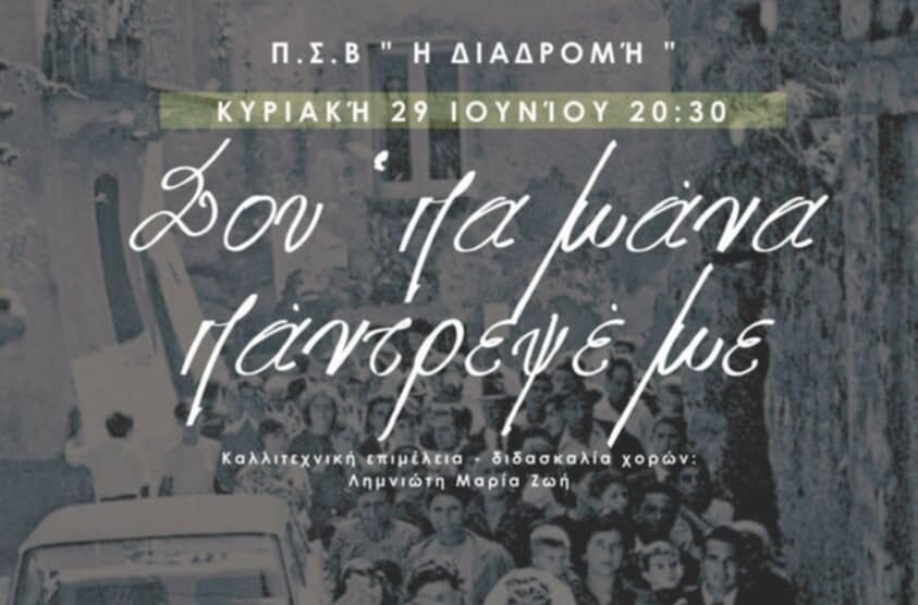 Ο Πολιτιστικός Σύλλογος Βόλου ” Διαδρομή” διοργανώνει την ετήσια μουσικοχορευτική και θεατρική παράσταση λήξης των μαθημάτων της εκπαιδευτικής χρονιάς, με τίτλο«Σου ‘πα μάνα πάντρεψέ με», την Κυριακή 29 Ιουνίου στις 20:30 στο προαύλιο της Αγίας Αικατερίνης με θέμα τον παραδοσιακό γάμο και το προξενιό, με το κοινό να ταξιδεύει σε Κρήτη, Θράκη, Μακεδονία, Πήλιο και Κύθηρα.Το «ταξίδι»αυτό, το πλαισιώνουν μουσικά οι: Βαγγέλης Μπαντελάς , Γιάννης Σκαμπαρδώνης, Αντώνης Βαγενάς, Ιάκωβος Μπαντιανούδης και Αντώνης Τρουμουλιάρης. Στην καλλιτεχνική επιμέλεια και διδασκαλία χορών, η Μαρία Ζωή Λημνιώτη. Στην συνέχεια θα ακολουθήσει γλέντι για όλο τον κόσμο. Η είσοδος είναι ελεύθερη.