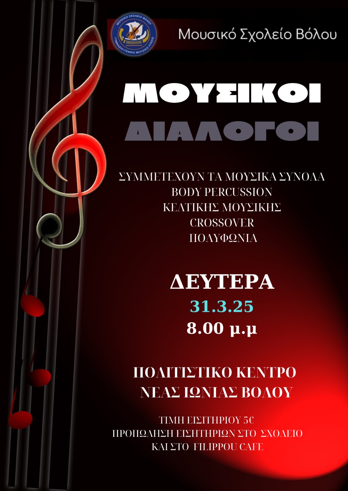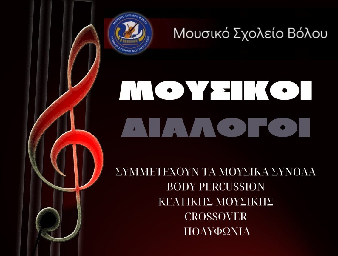 Τη Δευτέρα 31 Μαρτίου και ώρα 8:00 μμ το Μουσικό Σχολείο Βόλου παρουσιάζει μια ξεχωριστή συναυλία τεσσάρων μουσικών συνόλων στο Θέατρο του Πολιτιστικού Κέντρου Ν. Ιωνίας. Οι «Μουσικοί Διάλογοι», όπως είναι και ο τίτλος της βραδιάς, είναι η τρίτη κατά σειρά συναυλία που δίνουν αυτά τα μουσικά σύνολα και είναι φυσικό να αναμένεται με ιδιαίτερο ενδιαφέρον η συνέχεια, μετά τις επιτυχημένες εμφανίσεις των προηγουμένων ετών.