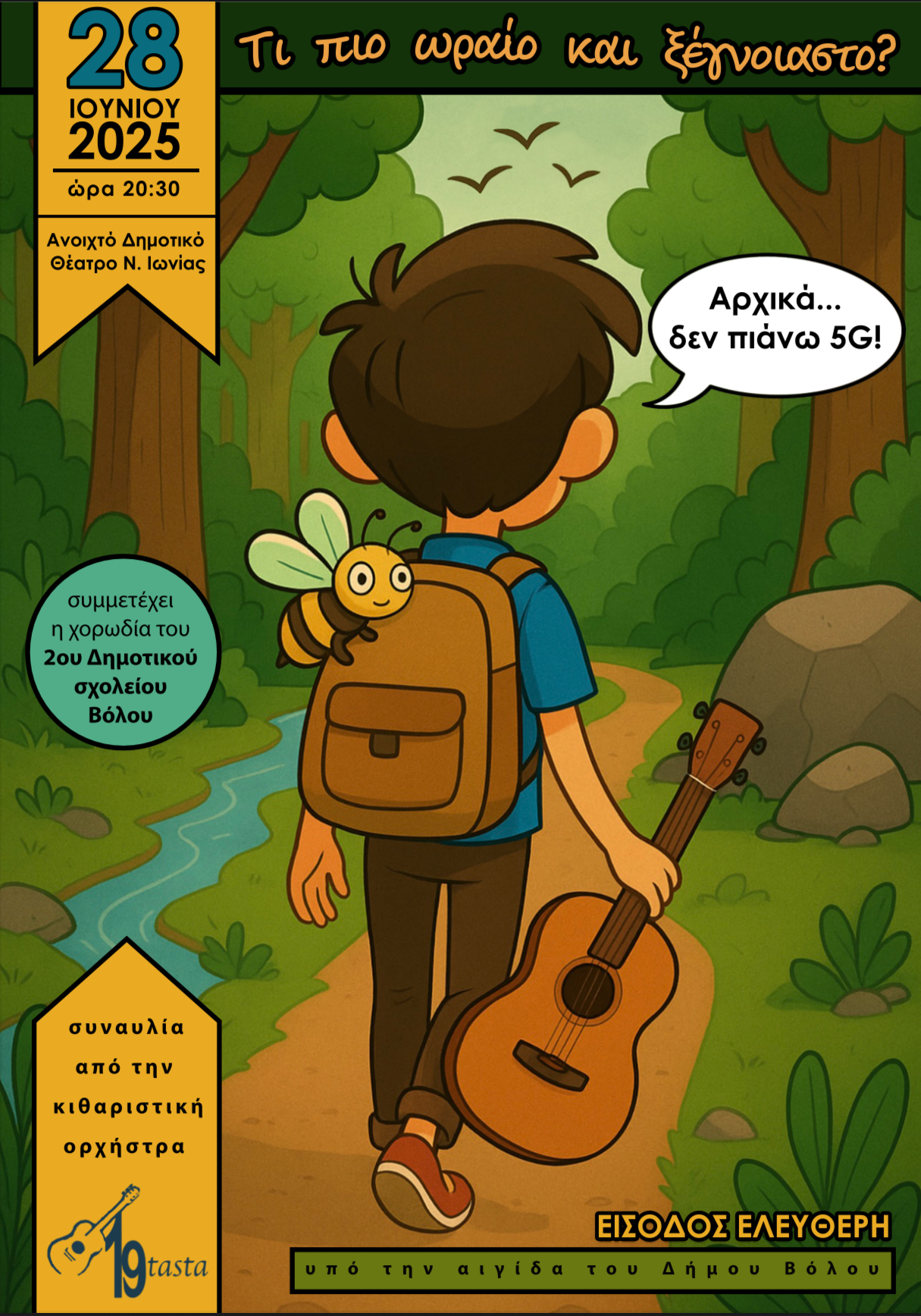 Η Κιθαριστική Ορχήστρα “19tasta” και το 2ο Δημοτικό Σχολείο Βόλου διοργανώνουν τη μουσικοθεατρική παράσταση “Το παραμύθι του Απόλλωνα” το Σάββατο 28 Ιουνίου στις 20:30 στο Ανοιχτό Δημοτικό Θέατρο Ν. Ιωνίας. 90 παιδιά θα βρεθούν επί σκηνής σε μια ηχο-ιστορία με χιουμοριστική διάθεση και θα επιχειρήσουν να ανατρέψουν τη σημερινή πραγματικότητα με τη βοήθεια της μουσικής.