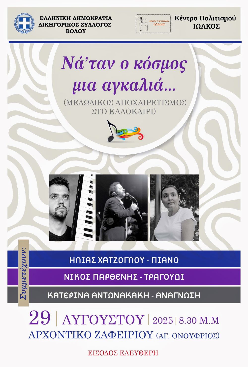 Ο Δικηγορικός Σύλλογος Βόλου και το Κέντρο Πολιτισμού ΙΩΛΚΟΣ συμπράττουν για την διοργάνωση μιας μουσικής-αναγνωστικής βραδιάς, με τίτλο «…Να ΄ταν ο κόσμος μια αγκαλιά…», μελωδικό «αποχαιρετισμό» στο φετινό καλοκαίρι.