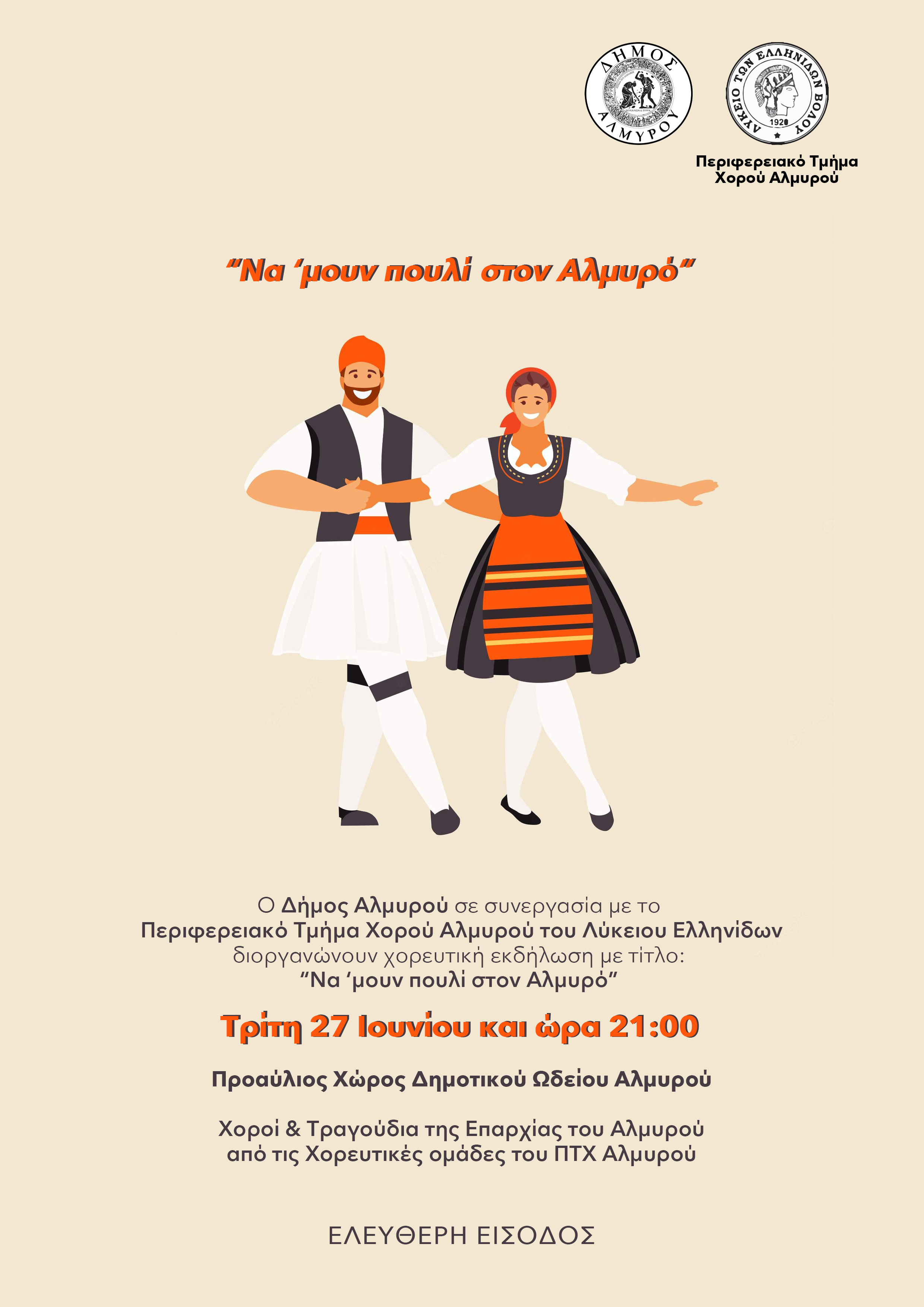 Ο Δήμος Αλμυρού σε συνεργασία με το Περιφερειακό Τμήμα Χορού Αλμυρού του Λυκείου Ελληνίδων διοργανώνουν χορευτική εκδήλωση με τίτλο «Να ‘μουν πουλί στον Αλμυρό» την Τρίτη 27 Ιουνίου στις 21:00 στον προαύλιο χώρο του Δημοτικού Ωδείου Αλμυρού. Θα παρουσιαστούν χοροί και τραγούδια της Επαρχίας του Αλμυρού. Η είσοδος είναι ελεύθερη.