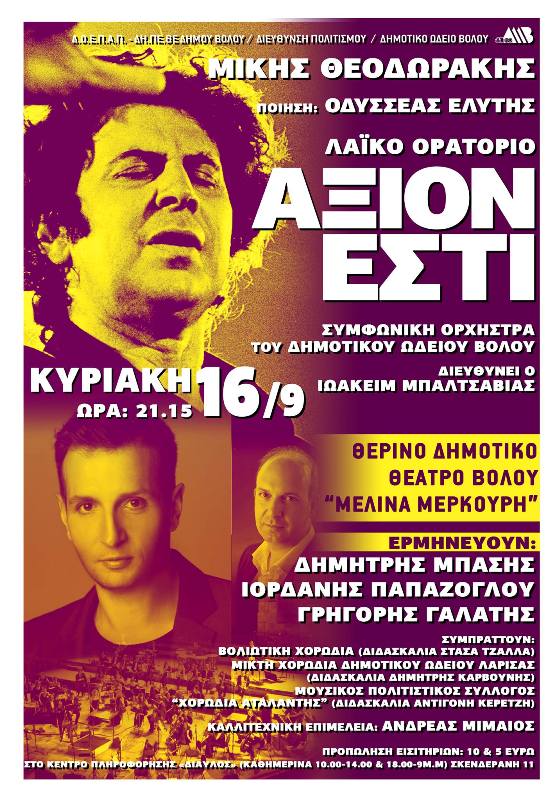 Η νέα ημερομηνία για την παρουσίαση του «ΑΞΙΟΝ ΕΣΤΙ», που αναβλήθηκε τον Ιούλιο λόγω των άσχημων καιρικών συνθηκών, είναι η Κυριακή 16 Σεπτεμβρίου και πάλι στο ΘΕΡΙΝΟ ΔΗΜΟΤΙΚΟ ΘΕΑΤΡΟ ΒΟΛΟΥ «ΜΕΛΙΝΑ ΜΕΡΚΟΥΡΗ», στις 9:15 μ.μ. Στην μεγάλη αυτή συναυλία με την Συμφωνική Ορχήστρα του Δημοτικού Ωδείου Βόλου υπό τη διεύθυνση του μαέστρου Ιωακείμ Μπαλτσαβιά ερμηνεύουν επί σκηνής ο διακεκριμένος τραγουδιστής Δημήτρης Μπάσης με την ρωμαλέα, λαϊκή φωνή του και τις πολύ ιδιαίτερες ερμηνείες του (λαϊκός τραγουδιστής). Μαζί του ο βαρύτονος Ιορδάνης Παπάζογλου (ψάλτης), ο ηθοποιός-σκηνοθέτης Γρηγόρης Γαλάτης (αφηγητής) καθώς και τρεις χορωδίες: η «Βολιώτικη» (διδασκαλία Στάσα Τζάλλα), η «Μικτή Χορωδία του Δημοτικού Ωδείου Λάρισας» (διδασκαλία Δημήτρης Καρβούνης) και ο Μουσικός Πολιτιστικός Σύλλογος «Χορωδία Αταλάντης» (διδασκαλία Αντιγόνη Κερετζή). Τη μουσική επιμέλεια της συναυλίας έχει αναλάβει ο καλλιτεχνικός διευθυντής του Δημοτικού Ωδείου Βόλου Ανδρέας Μιμαίος. Προπώληση εισιτηρίων: 10 & 5 ευρώ στο Κέντρο Πληροφόρησης «Δίαυλος» (καθημερινά 10π.μ.-2μ.μ & 6μ.μ-9μ.μ, από τις 10 Σεπτεμβρίου και μετά), στην οδό Σκενδεράνη 11 και την ημέρα της παράστασης, στο ταμείο του Θερινού Δημοτικού Θεάτρου Μελίνα Μερκούρη. Πληροφορίες στο τηλέφωνο 24210-36992.