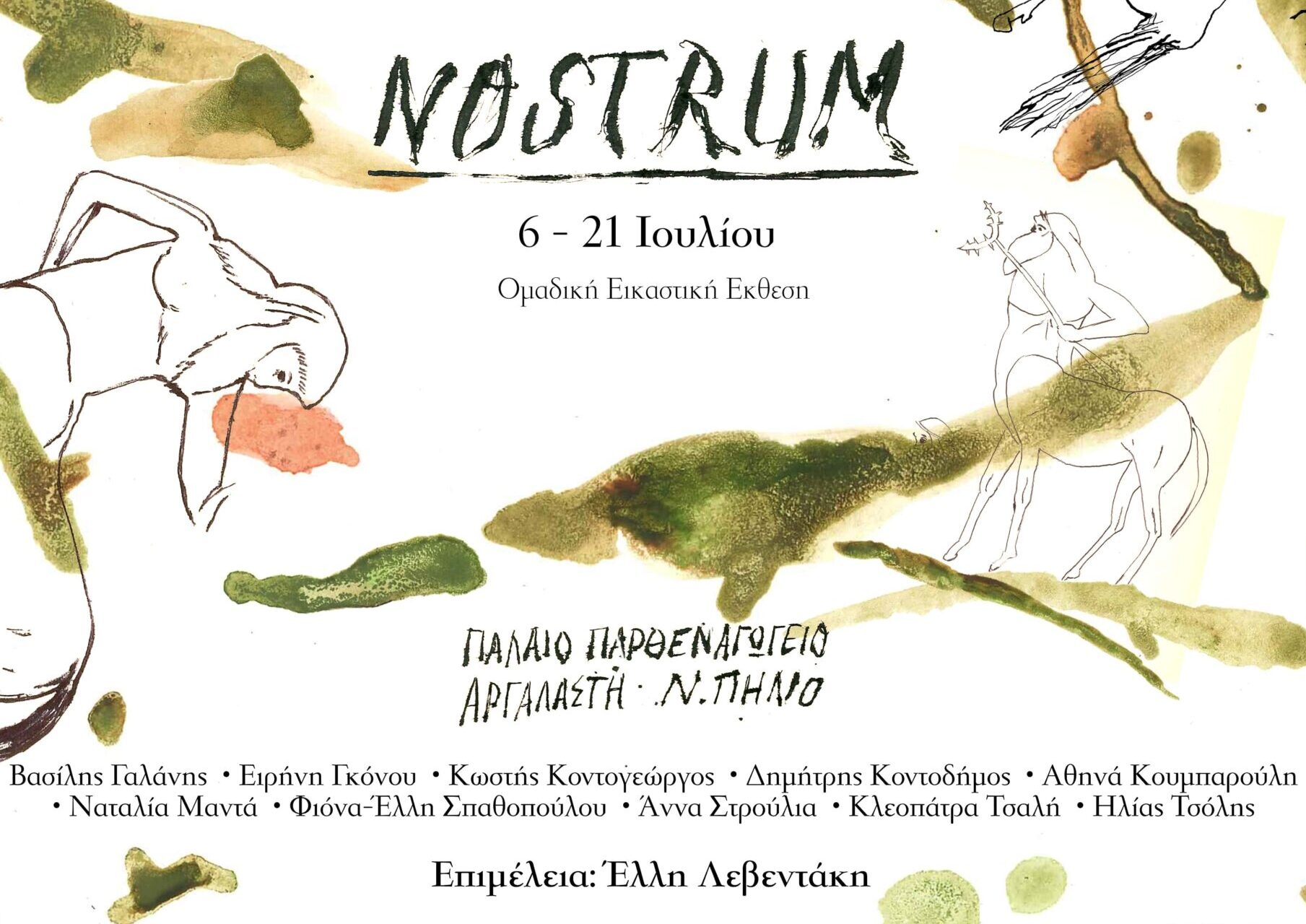 Η επιμελήτρια και ιστορικός τέχνης, Έλλη Λεβεντάκη, σημειώνει στο κείμενο της έκθεσης: «Στα λατινικά nostrum σημαίνει δικό μας, ενώ στα αγγλικά η λέξη μεταφράζεται ως γιατροσόφι ή φάρμακο πάσης φύσεως, συμπυκνώνοντας έτσι τις έννοιες της συλλογικότητας και της θεραπείας. Η έκθεση θίγει το επείγοντος του ζητήματος της κλιματικής αλλαγής, με ομαδικό τρόπο, ως αντίδοτο στην μαζική ανθρώπινη παρέμβαση που οδηγεί στην αλλοίωση του περιβάλλοντος και τις φυσικές καταστροφές. Σε αυτό το πλαίσιο, παρουσιάζονται έργα που σχετίζονται με το φυσικό τοπίο του Πηλίου, τη μυθολογία του και τα τοπικά υλικά, τα οποία πραγματεύονται τη σχέση του ανθρώπου με τη φύση μέσα από παλιά και νέα εικονογραφικά μοτίβα χλωρίδας και πανίδας, την ανθρώπινη παρέμβαση στο περιβάλλον ως μια σύνθετη και πολυεπίπεδη διαδικασία, καθώς και τρόπους ίασης και προστασίας με συμβολικό ή τελετουργικό χαρακτήρα».