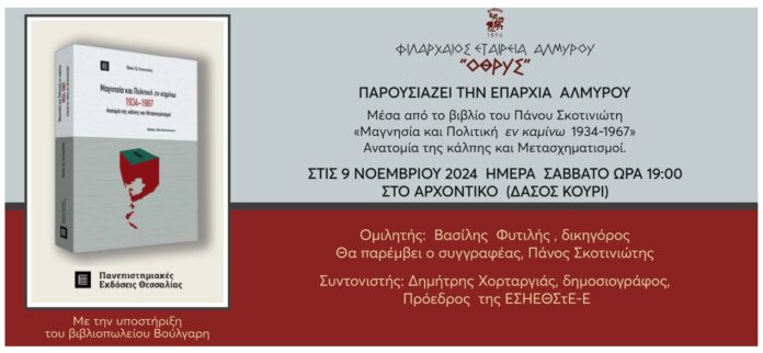 Η Φιλάρχαιος Εταιρεία Αλμυρού «Όθρυς» παρουσιάζει σε ειδική εκδήλωση την Επαρχία Αλμυρού, μέσα από το βιβλίο του Πάνου Σκοτινιώτη «Μαγνησία και Πολιτική εν καμίνω, 1934-1967. Ανατομία της κάλπης και Μετασχηματισμοί». Η εκδήλωση θα πραγματοποιηθεί το Σάββατο 9 Νοεμβρίου στις 19.00, στο «ΑΡΧΟΝΤΙΚΟ» (δάσος Κουρί). Θα μιλήσει ο δικηγόρος Βασίλης Φυτιλής, θα παρέμβει ο συγγραφέας και ο συντονισμός της εκδήλωσης θα γίνει από τον δημοσιογράφο και πρόεδρο της ΕΣΗΕΘΣτΕ-Ε Δημήτρη Χορταργιά. Την εκδήλωση υποστηρίζει το βιβλιοπωλείο Βούλγαρη.