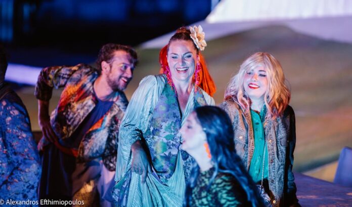 Με εννέα ηθοποιούς και δύο μουσικούς ένας κόσμος που επιζητεί την ενότητα και τη αρμονία χτίζεται επί σκηνής. Η σκηνοθεσία δομεί μια υβριδική φόρμα μουσικού θεάτρου μέσα στην ελευθερία που απλόχερα γιορτάζει ο Αριστοφάνης. Η κεντρική εικόνα του σκηνικού, ένα έργο της μεγάλης Αμερικανίδας ζωγράφου Georgia O’ Keefe, είναι εικόνα σύνθεσης των αντιθέτων, αρσενικού – θηλυκού που ανακαλεί μνήμες χαράς και ευημερίας. Η αθυροστομία του Αριστοφάνη αντιμετωπίζεται με την αθωότητα ενός παιδιού που ακόμα δεν εισήλθε στις κοινωνικές συμβάσεις της ενηλικίωσης. Η παράσταση είναι μια διαφορετική πρόταση για τον Αριστοφάνη δραματουργικά και σκηνοθετικά. Σημαντική συμβολή, η μετάφραση -ειδικά για το Θεσσαλικό- του Θωμά Ψύρρα που φέρνει κάτι ιδιαίτερο από την Τυρναβίτικη (και Θεσσαλική εν γένει) «Αριστοφανική» παράδοση.