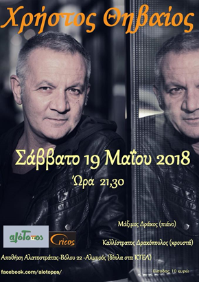 Μαζί του οι Μάξιμος Δράκος (πιάνο) και Καλλίστρατος Δρακόπουλος (κρουστά). Σας περιμένουμε στην Αποθήκη Αλατοστράτας ..στον Αλότοπο. Το Σάββατο 19 Μαΐου 2018, έναρξη: 21.30’