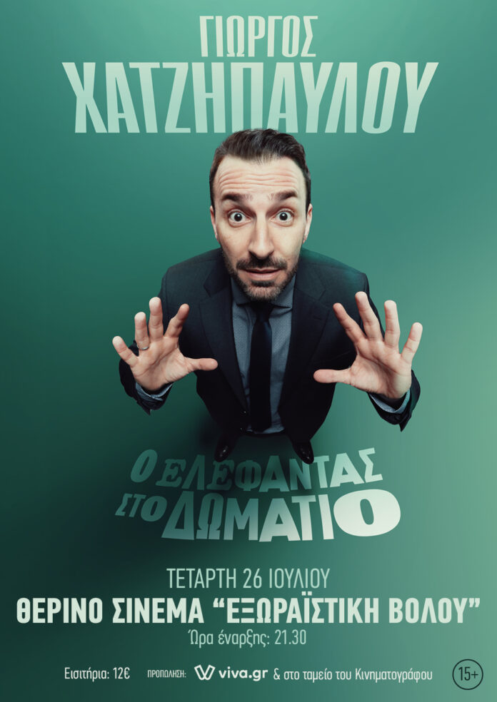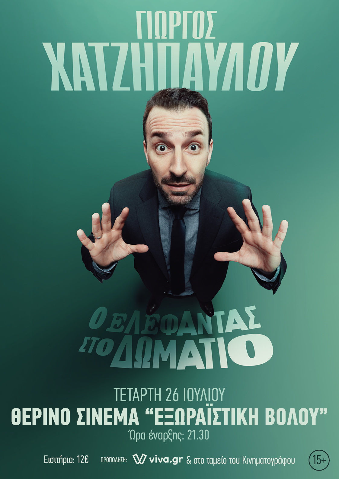 Γιώργος Χατζηπαύλου- «Ο ελέφαντας στο δωμάτιο» Πού: Θερινό Σινεμά «Εξωραϊστική Βόλου» Πότε: Τετάρτη 26 Ιουλίουστις 21:30 Τιμή εισιτηρίου: 12 €
