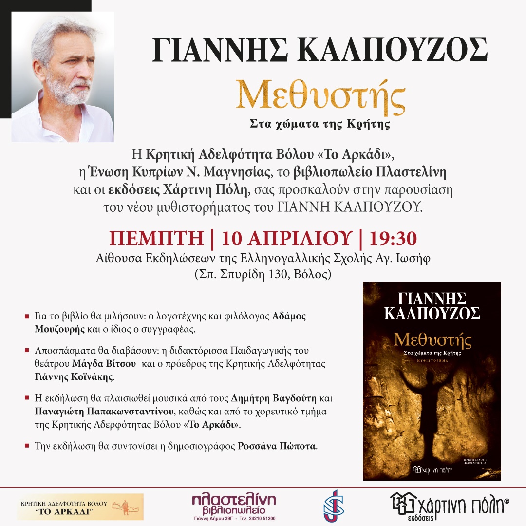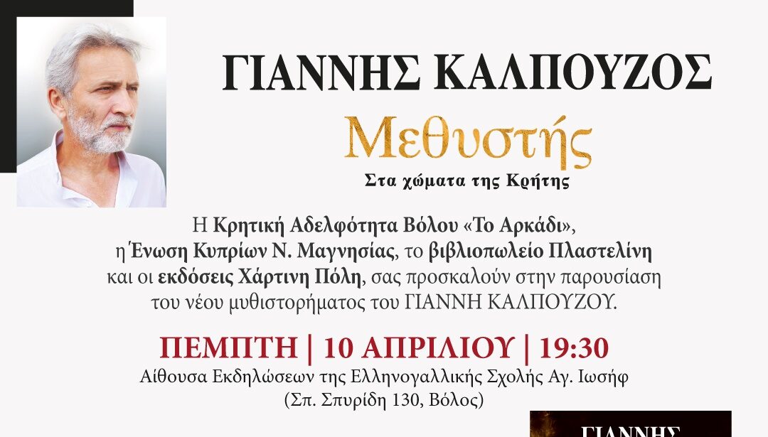 H Κρητική Αδελφότητα Βόλου «ΤΟ ΑΡΚΑΔΙ», Η Ένωση Κυπρίων Ν. Μαγνησίας, το βιβλιοπωλείο Πλαστελίνη και οι εκδ. Χάρτινη Πόλη, διοργανώνουν την παρουσίαση βιβλίου του νέου μυθιστορήματος του Γιάννη Καλπούζου με τίτλο “Μεθυστής, στα χώματα της Κρήτης” την Πέμπτη 10 Απριλίου στις 7:30μ.μ., στην Αίθουσα Εκδηλώσεων της Ελληνογαλλικής Σχολής Αγ. Ιωσήφ (Σπ. Σπυρίδη 130).