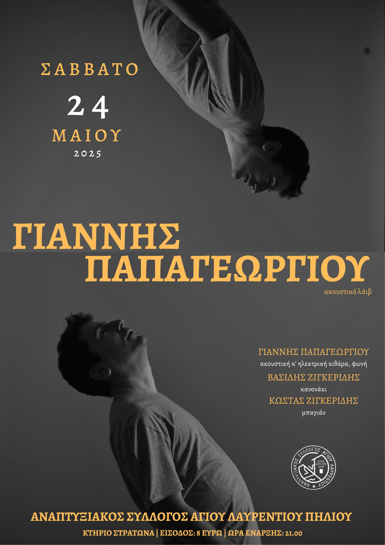 Ο Αναπτυξιακός Σύλλογος Αγίου Λαυρεντίου με χαρά φιλοξενεί το Σάββατο 24 Μαΐου στις 21:00 στο κτήριο Στρατώνα, τον ξεχωριστό τραγουδοποιό Γιάννη Παπαγεωργίου για μια μοναδική μουσική βραδιά γεμάτη συναίσθημα, αυτοσχεδιασμό και αγαπημένα τραγούδια.